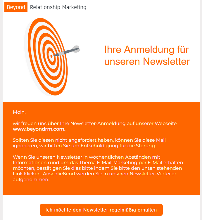 Bei unseren Anmeldeformularen ist das Double-Opt-In-Verfahren (DOI) Standard. Hierbei erhält die Neu-Abonnentin oder der Neu-Abonnent nach der Registrierung auf Ihrer Webseite eine E-Mail zugesandt, die Sie nach Ihren Wünschen gestalten können.